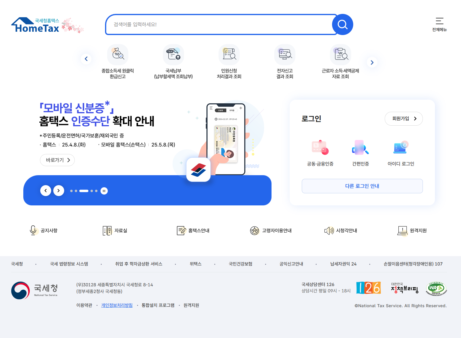 - 로그인 방식: 공동인증서, 간편인증(카카오, 네이버 등) 중 선택